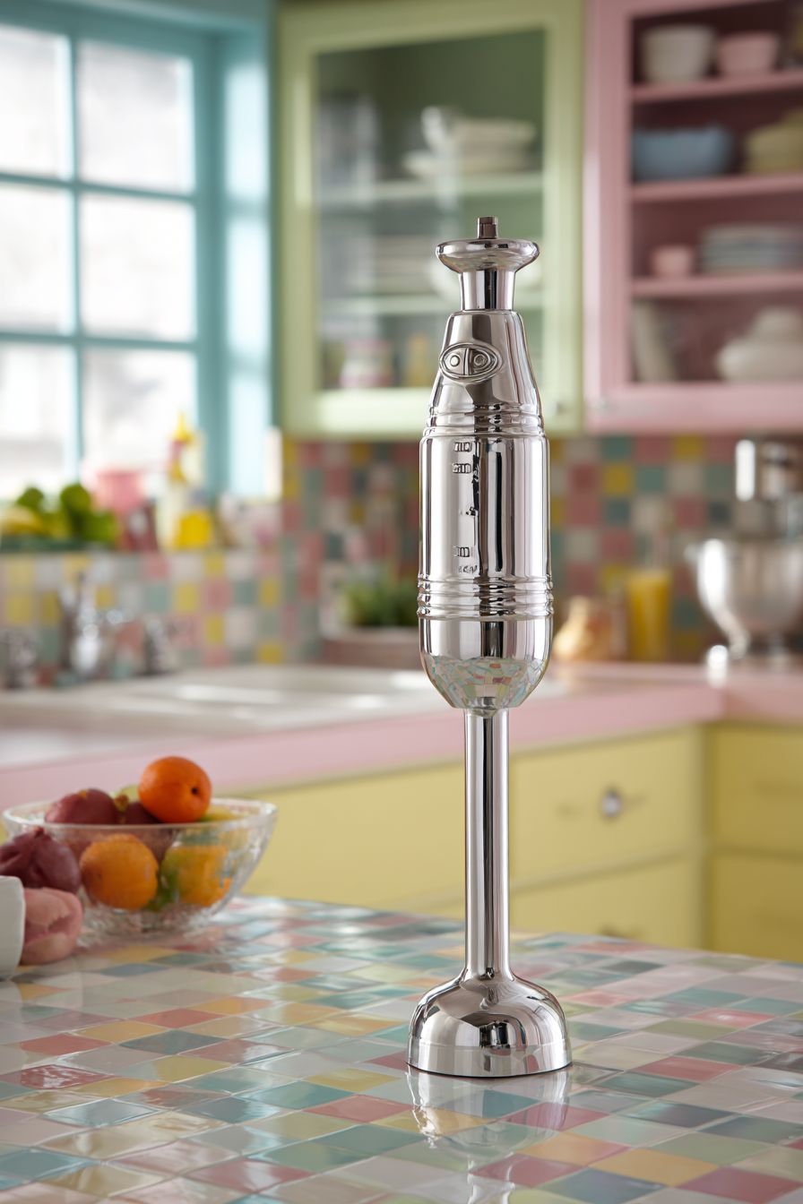 A sleek chrome hand blender stands upright, combining retro inspiration with modern simplicity. Its reflective surface adds a clean, polished look.