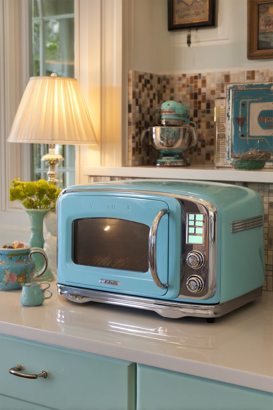 A retro-style microwave in soft blue adds charm without sacrificing convenience. The chrome knobs and rounded edges give it a classic look.