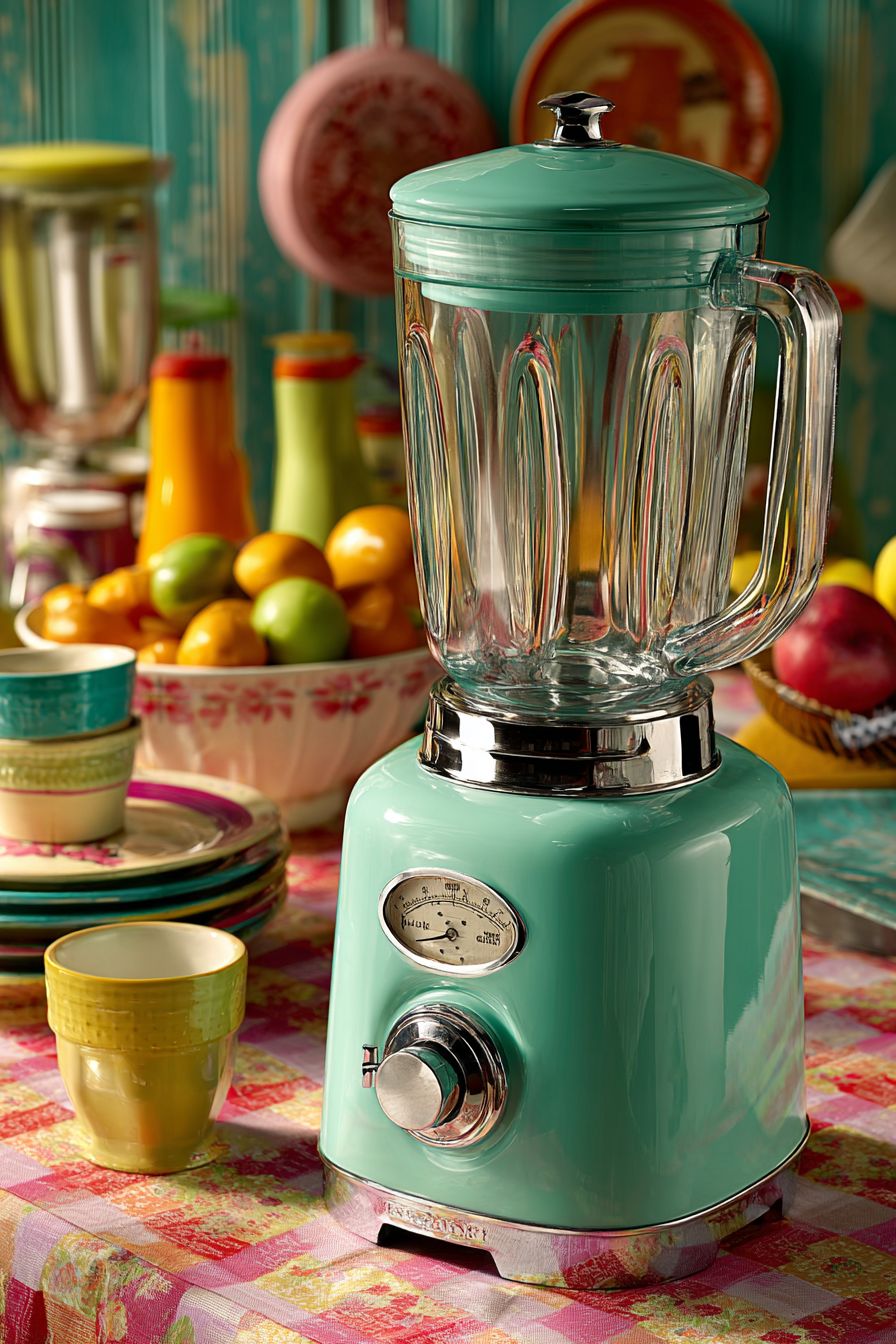 A mint-colored blender surrounded by colorful fruits and dishes creates a lively and cheerful scene.