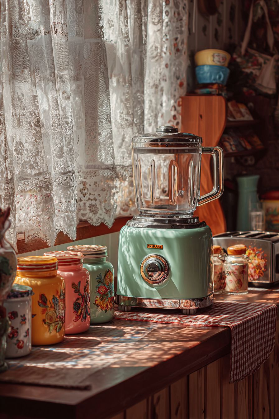 This blender is placed in a rustic setting with warm tones and vintage jars. The combination of textures creates a cozy farmhouse-inspired retro look.