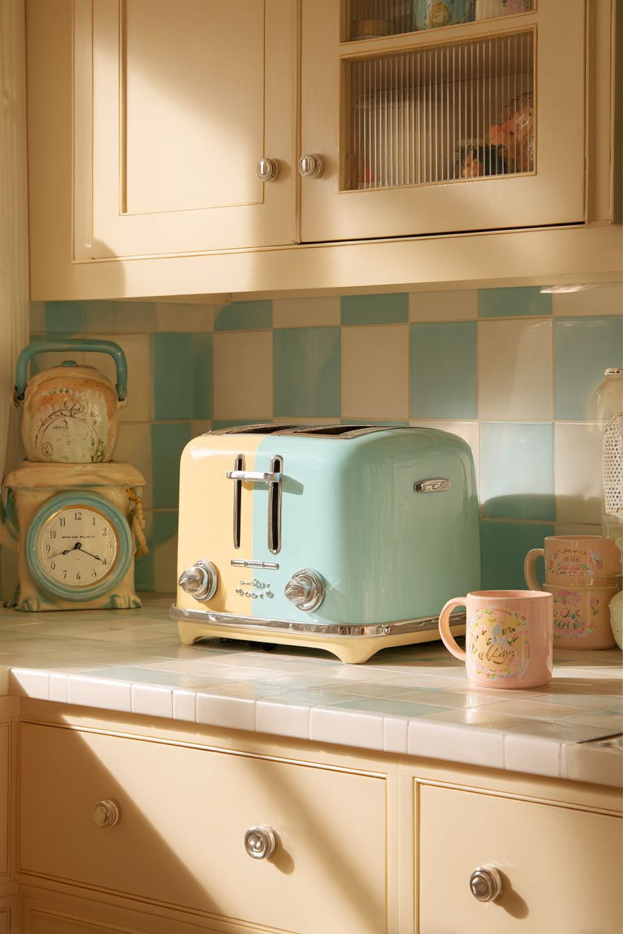 This pastel blue and cream toaster brings a soft, nostalgic feel to the kitchen. The rounded edges and chrome details reflect classic mid-century design.