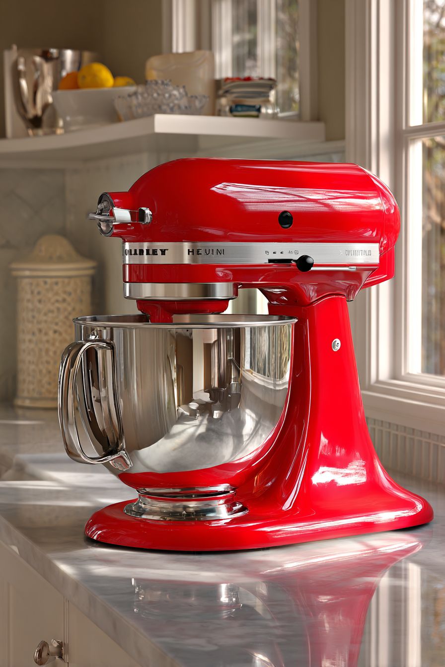 A red stand mixer sits beautifully on a marble countertop, combining functionality with iconic design. Its polished metal bowl reflects light, adding depth and elegance.