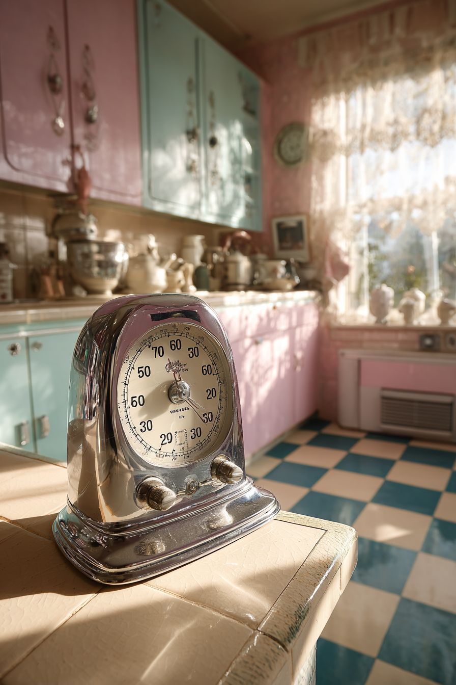 Placed in a pastel-toned kitchen with checkered flooring, the scale adds both texture and nostalgia. It’s a perfect accessory for those who want subtle vintage details.